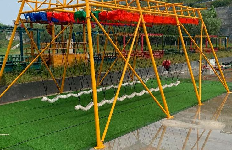 二、雙龍秋千。是一個多人互動的無動力游樂設備,采用全新加厚鋼材鋼管來加固結構的,整個秋千占地6.5x13米,有兩排秋千繩組成,每排能站18人,游客可以組隊一起玩秋千,配合著搖擺音樂,讓游客互動起來。這款設備針對的游玩年齡比較廣泛,小孩,青少年,成年人都可以玩,也是一個網紅游樂項目。