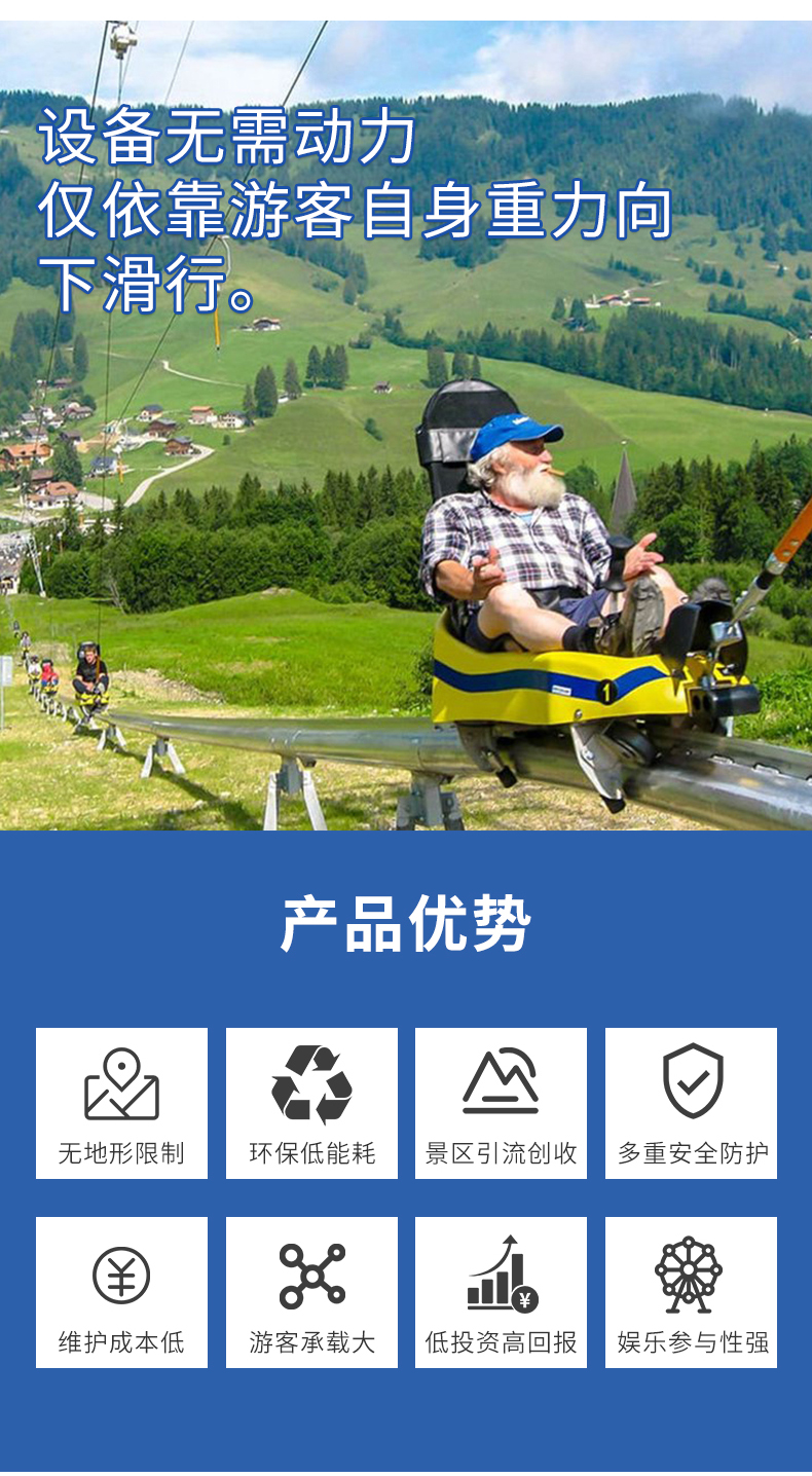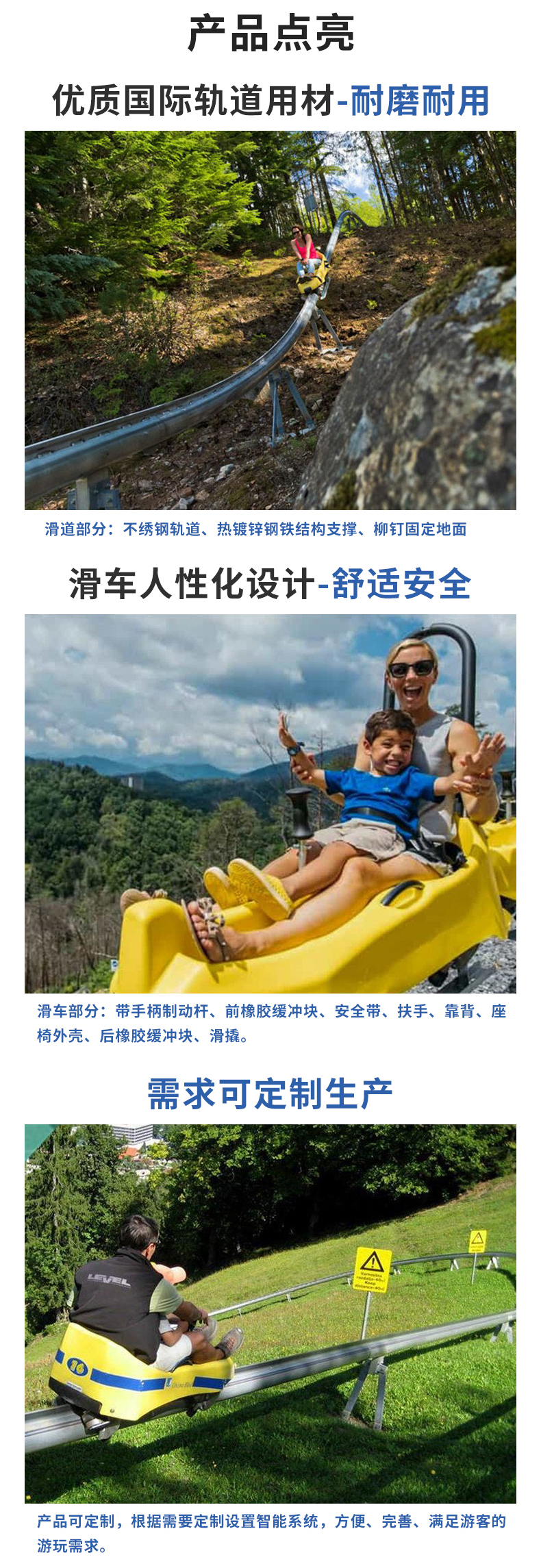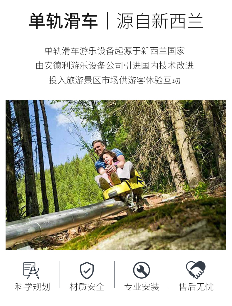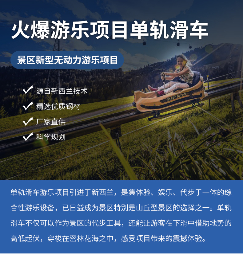 單軌式滑道不僅可以作為景區(qū)代步工具、還能讓游客在下滑中借助地勢(shì)的高低起伏,穿越在密林花海之中,感受項(xiàng)目帶來的震撼體驗(yàn),具有參與性的娛樂設(shè)施,日益受人們歡迎,是景區(qū)中一種投資低、見效快的新型娛樂與代步為一體的娛樂設(shè)施。