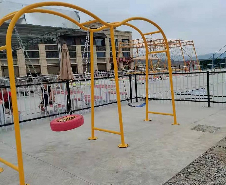 材料:型材、60圓管厚度2.0、 輪胎秋千、輪胎直徑60厘米上面繩網(wǎng)編織 安裝、使用鍍鋅鏈條.粉末噴涂高溫烘烤.噴塑工藝